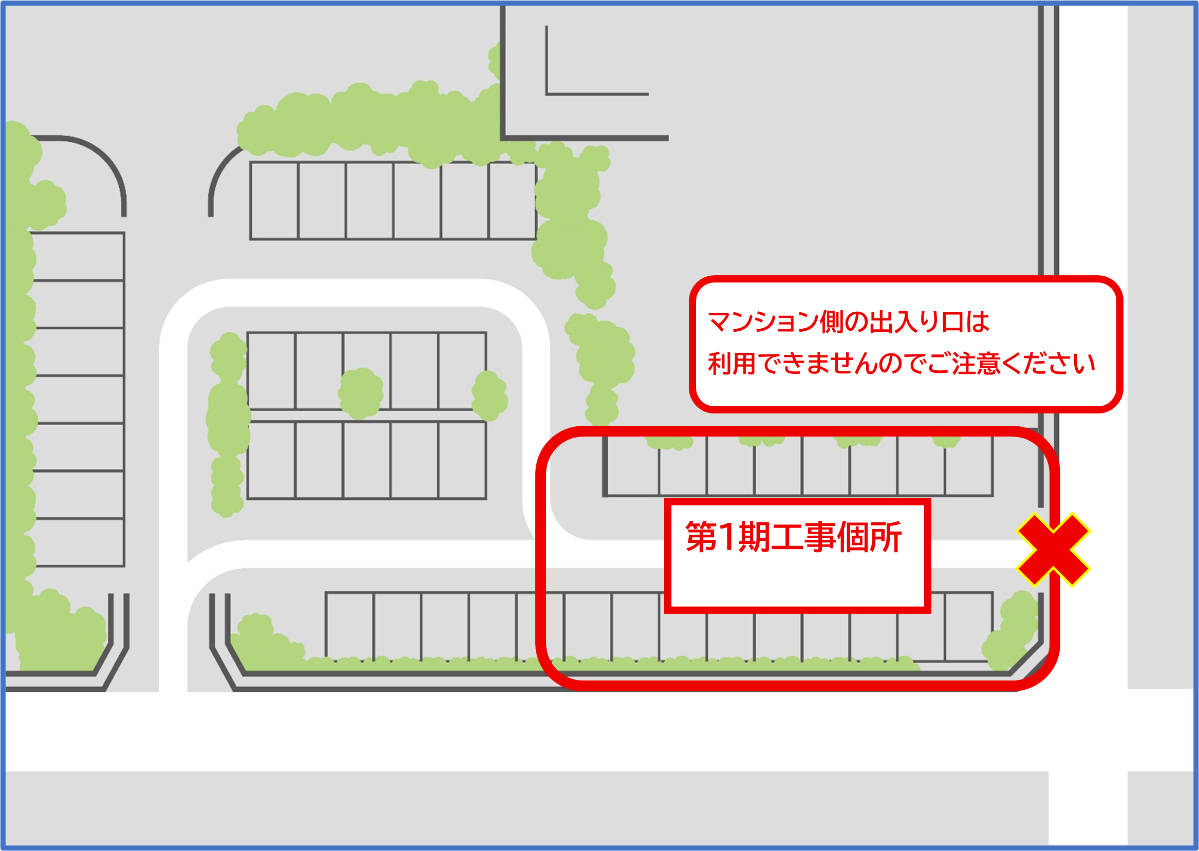 工事期間中は、駐車台数の減少や出入口の制限によりご不便をおかけいたしますが、